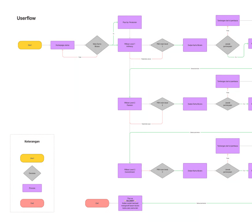 This userflow stage was treated to help our collaboration as UI/UX designers find out the position of entry point to end point from using the Love Card feature. What steps do users have to go through to complete this game, what is needed, and what will the user get?