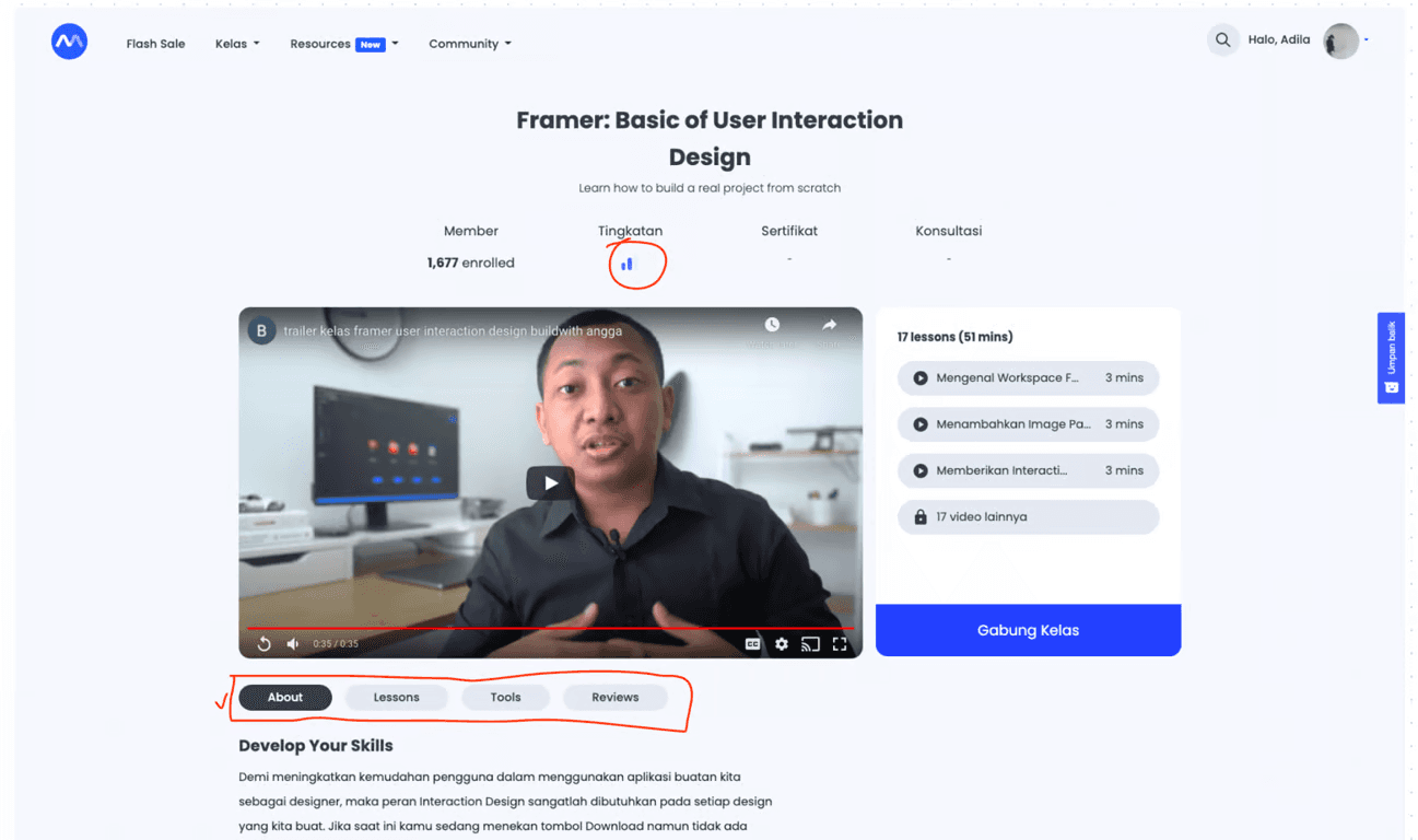 In each discussion there is also an indicator of the difficulty level of each class - whether this class is suitable for beginner or advanced level. The details of each class are very easy for students to access. Students can directly access it by pressing the tab feature below the learning video.