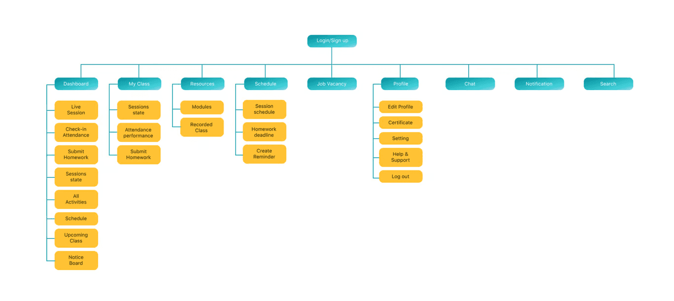 This sitemap functions as a determinant of what content is needed on each page in the Student Dashboard. Apart from that, this sitemap can also help the Developer team in developing this product later.