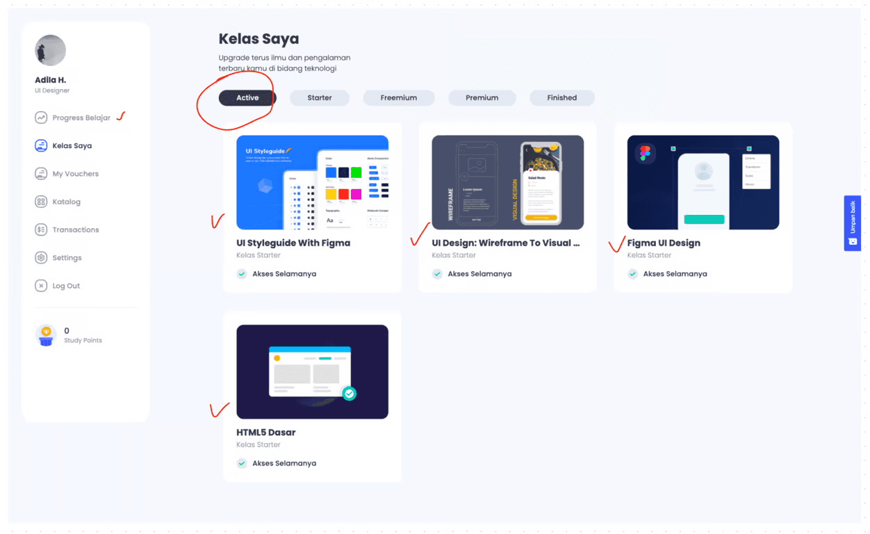 In the BuildwithAngga class dashboard, I can see which classes I have taken and they are even divided into several categories, such as: Active, Starter, Freemium, Premium and Finished.