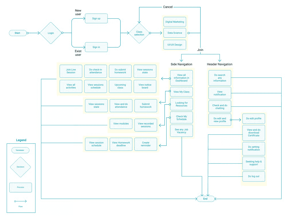 From the Sitemap, I then translated it into userflow with the use case of a student taking one of the classes (example: Data Science) - then the student can see all the information on the main Dashboard page and can access the class directly without having to open it in another menu.